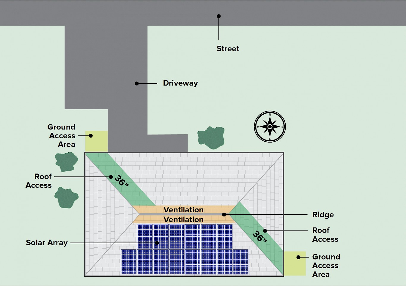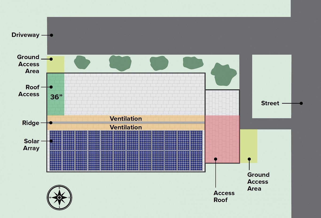 These together require 3 feet of clearance from the ridge of a pitched roof so that firefighters can ventilate homes, as well as a 3 foot pathway through which they can access the roof.