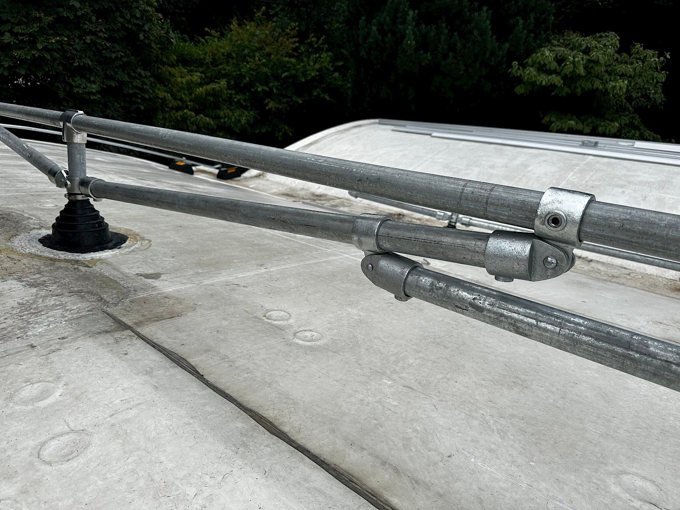 So we built our own custom solar racking system from 1.5" galvanized steel pipe. We choose galvanized steel pipe because it is thick, durable, long-lasting, and weather resistant. To further strengthen the structure, we sistered the horizontal pipe with a diagonal one extending from the base of our attachement point.