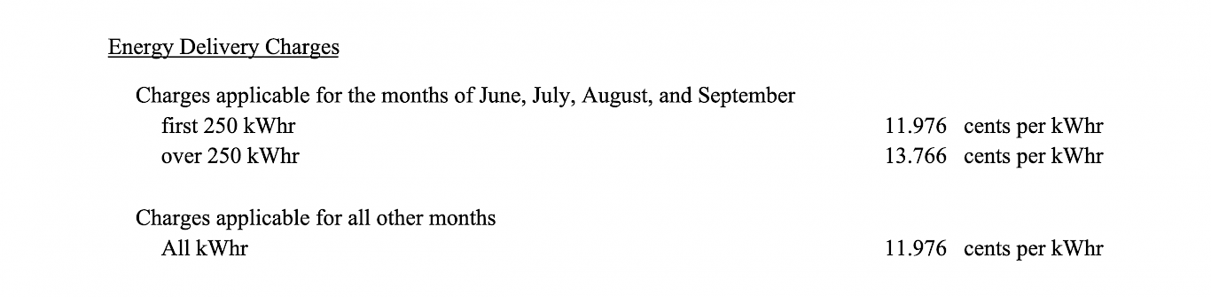 On the delivery side, Con Ed sets the "tariff" or price it charges different teirs of customers every year, those prices being approved by the New York Public Service Commission. Still, if you have sharp eye, or are simply keen to examine your bill, you'll notice slight fluctuations in the delivery rate during the months of June, July, August and September. That's becuase for residential "Rate I" customers there are two delivery rates during those months: one for the first 250kwh and one for all electricity consumed after that. See chart below: